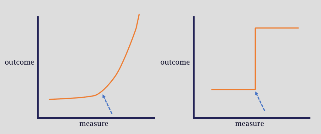Literature from emergency medicine shows how dramatically discrete thinking plays out in decision making. This work* from Stephen Coussens demonstrates how the intensity of work-up for ischemic heart disease differs greatly if you are just above or just below the cutoff of 40 years of age! (The graphs from page 30 onward in the PDF most clearly illustrate this phenomenon).