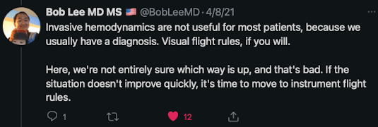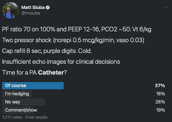 Unselected invasive devices probably don’t help anyone, and that’s probably how the PA catheter fell out of favor in the first place. I might have attempted this management plan with a standard central line to start, but with such high severity of illness, and the likelihood I’d remove it soon, the risk:benefit ratio seemed favorable for the PAC.