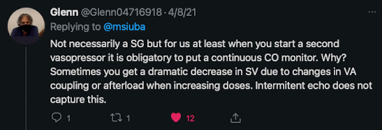 This patient’s physical exam supported the diagnosis of insufficient cardiac output, which is confirmed based on these findings. That said, the clinical history and lung US were suggestive of pneumonia and secondary septic shock. In the end, this was felt to be mixed shock. Vasopressin was already discontinued, and the decision was made to initiate dobutamine on top of norepinephrine.